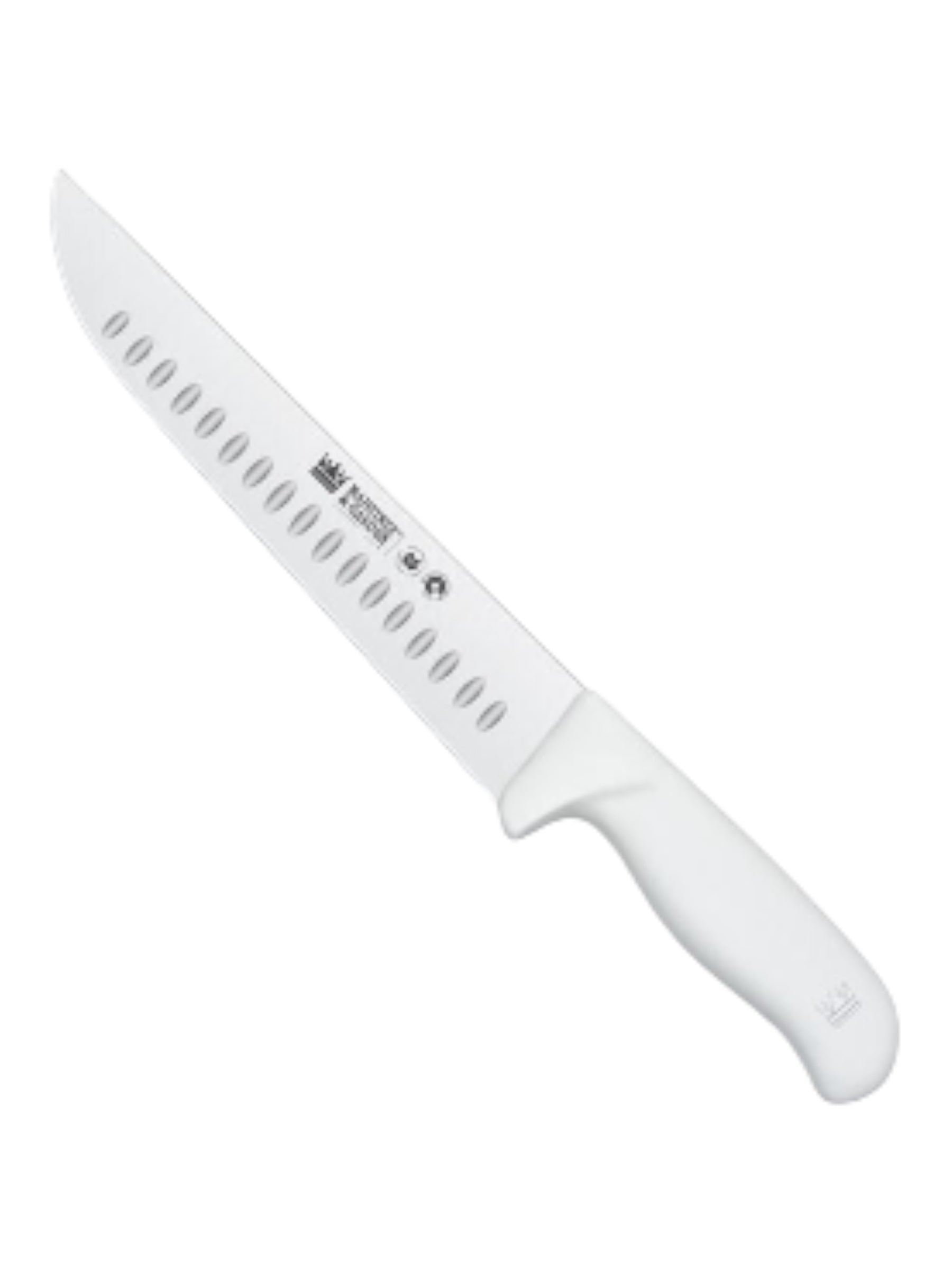 Cuchillo carnicero 22,5 cm mango pp fibra blanco - Serie Pablo Montiel. Es un cuchillo pensado para los profesionales mas exigentes de la industria cárnica, salas de despiece, mataderos, carnicerías, etc. Los alveolos en la superficie de la hoja evitan que los restos de alimentos blandos se adhieran al cuchillo al cortar.