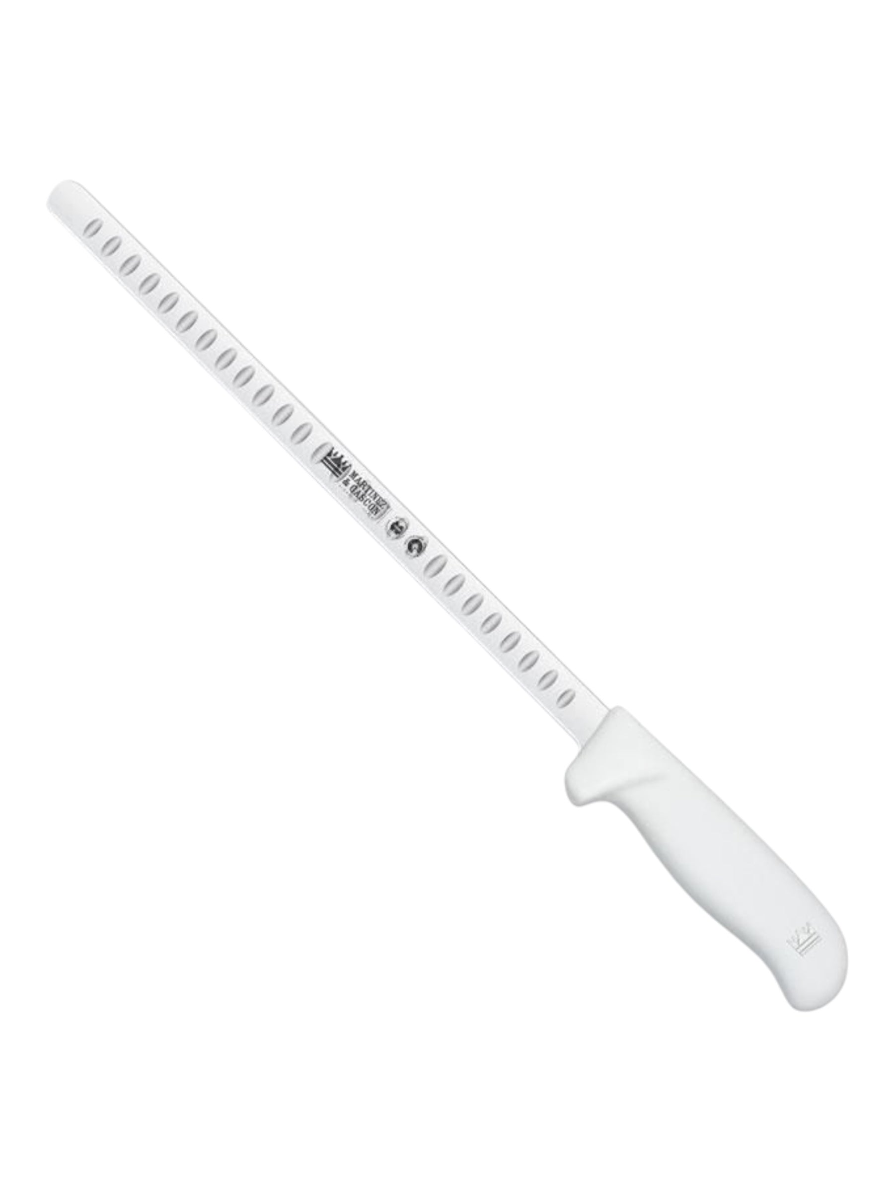 Este cuchillo de larga, afilada y flexible hoja te permitirá cortar finísimas lonchas. Los alveolos distribuidos uniformemente a lo largo de la hoja evitan que los alimentos se adhieran a la hoja, algo particularmente útil cuando se necesita practicar cortes muy finos.