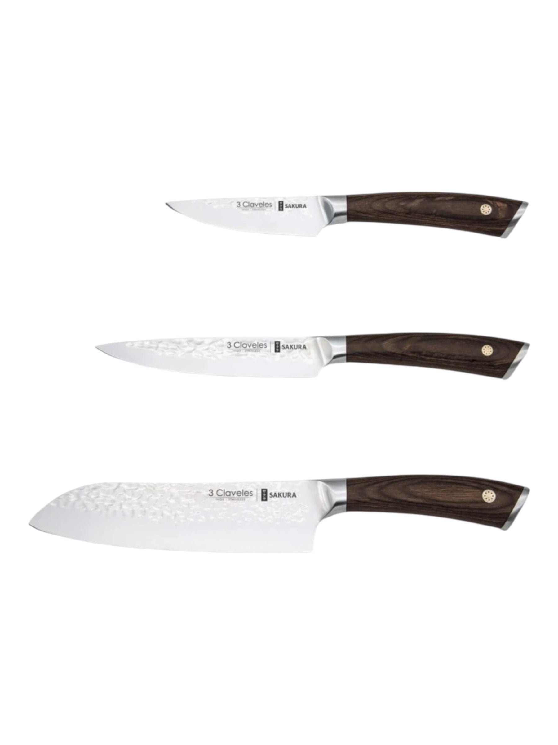 - Incluye un cuchillo de verduras, un cuchillo cocinero y un cuchillo santoku.