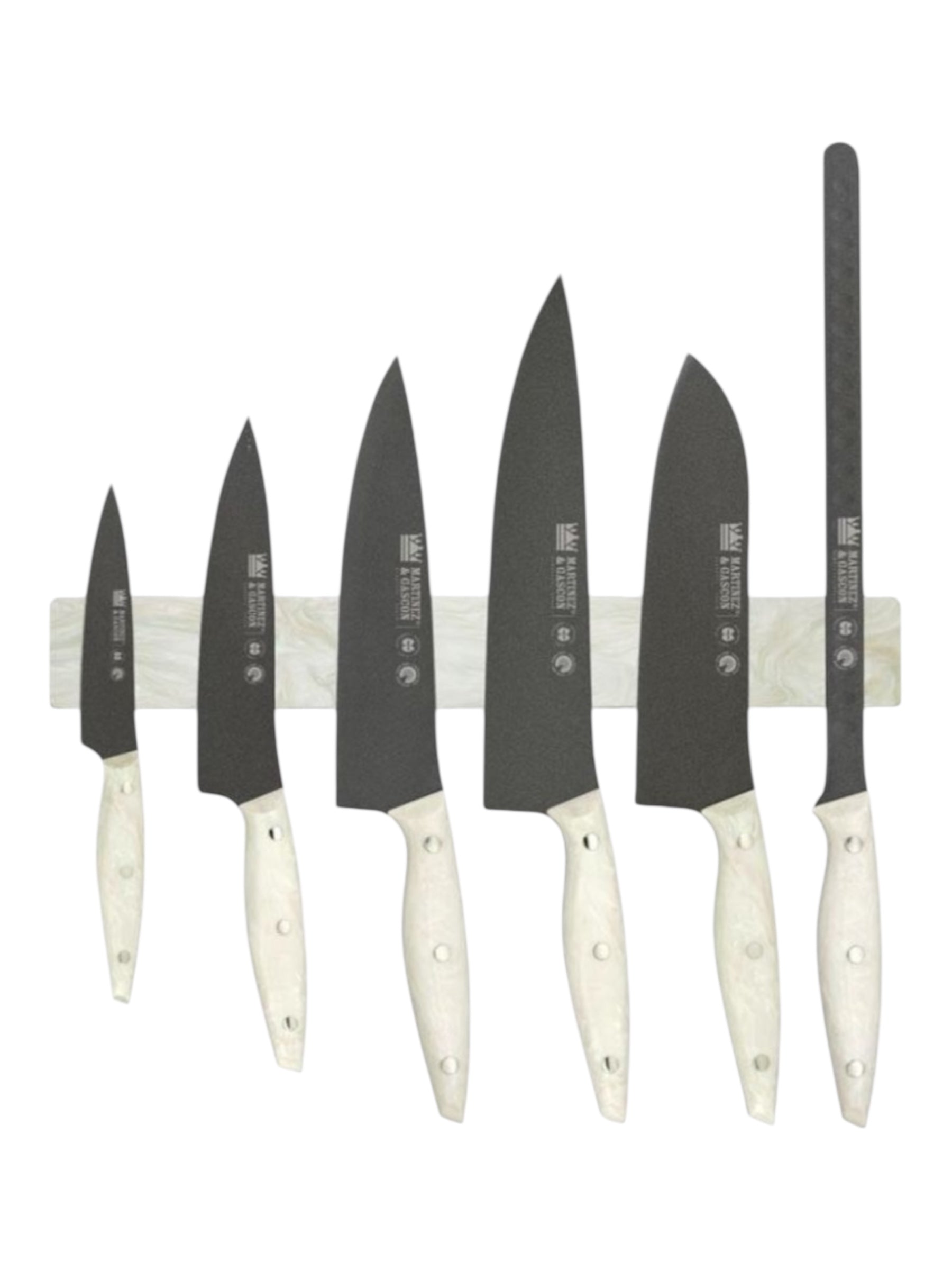Es un conjunto de cuchillos de alta calidad de Martínez & Gascón. Este set está diseñado para usos en cocina y cuenta con hojas de acero MOVA recubiertas de Teflón, lo que proporciona durabilidad y una excelente resistencia a la corrosión. Los mangos están hechos de Mikarta, un material resistente y ergonómico.